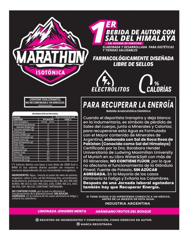 Cuando el deportista transpira y deja manchas blancas en la indumentaria, esto es un signo de pérdida de sales, minerales y calorías del cuerpo. Para recuperarse, esta agua está formulada con el mayor contenido de minerales de Argentina, elaborada con sal de cristal de roca color rosado, proveniente de las laderas del monte Himalaya en Pakistán. Está certificada por el Institute of Biophysical Research, Las Vegas, Nevada, USA, con más de 60 minerales. No contiene flúor, por lo que no afecta el funcionamiento de la glándula pineal. Es una fuente de potasio y no contiene azúcar agregada. En la mayoría de los casos, elimina la fatiga y evita los calambres.